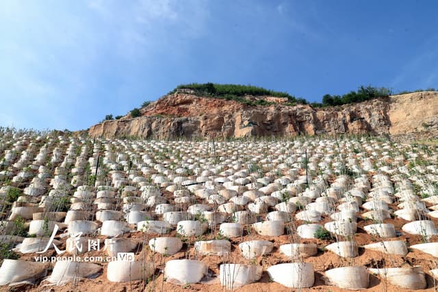 2022年6月25日,位于河北省石家庄市井陉县威州镇南固底村的河北省太行山区矿山掌子面治理技术试验项目现场。 2022年6月25日,在位于河北省石家庄市井陉县威州镇南固底村的河北省太行山区矿山掌子面治理技术试验项目现场,工作人员在对鱼鳞坑种植的树木进行养护。 2022年6月25日,在位于河北省石家庄市井陉县威州镇南固底村的河北省太行山区矿山掌子面治理技术试验项目现场,工作人员在对新种植的树木进